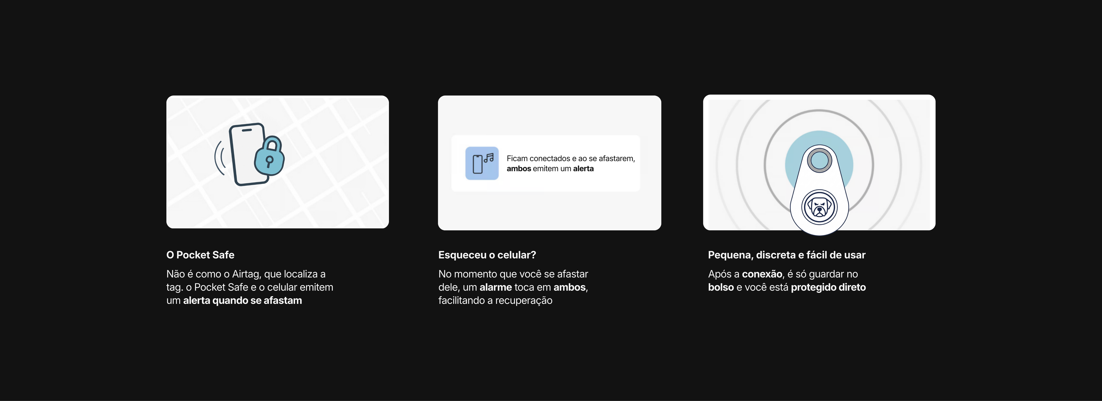 Tanto o seu celular quanto a tag Pocket Safe começam a emitir um som de alarme e luz de alerta. Ideal para evitar esquecimentos ou identificar tentativas de furto.